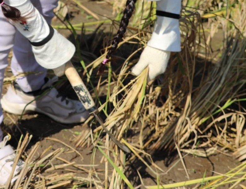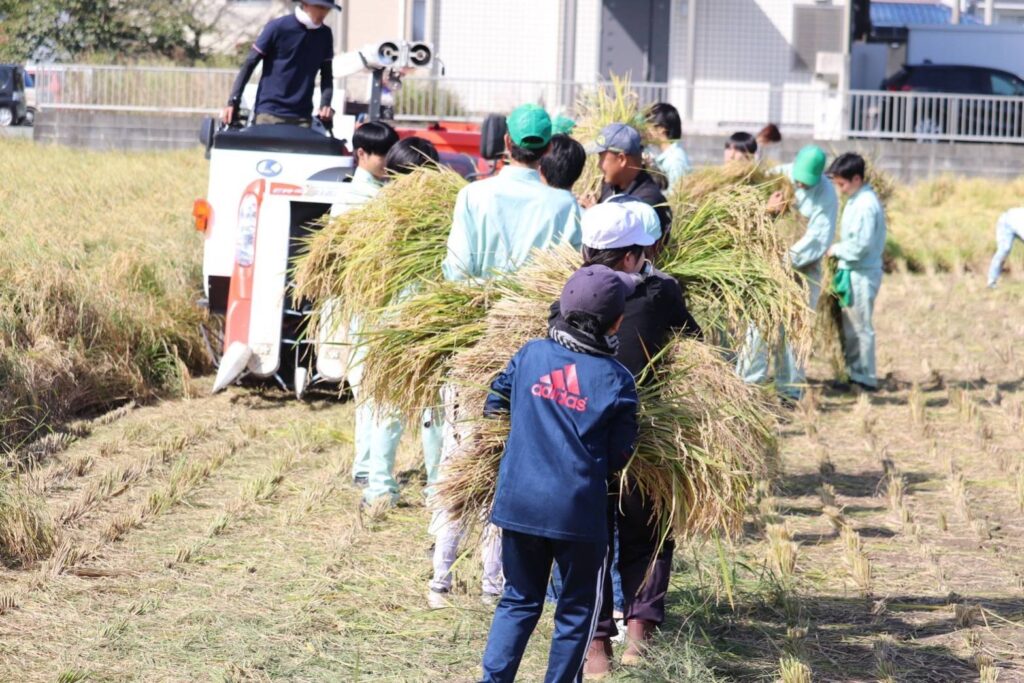 2023.10.14 お知らせ 稲刈りしました 2023/10/12 たくさん実ったね。稲刈り楽しい! 早く食べてみたいなあ。 お米って種なんだね。 上手に鎌で収穫。 みんなで力を合わせて収穫 自然の恵みに感謝 ミャクミャクと続く米作り。今年も成功!